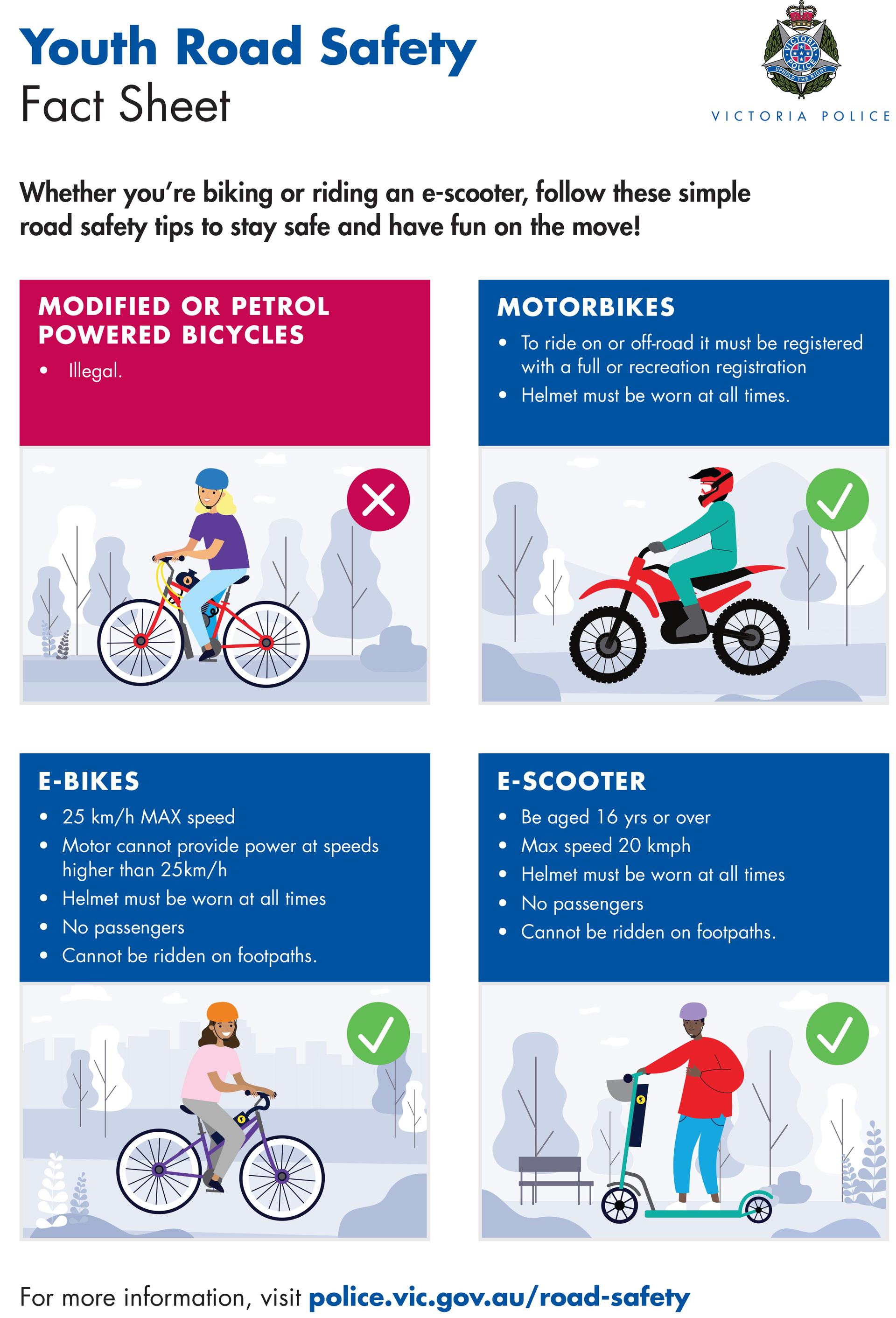 The main points we ask parents to consider are that riders MUST be 16 years or older to ride an E-scooter on a Victorian road legally. If their child does have an E-scooter, they should take the time to educate their child on the current road rules and appropriate behaviour when out in our community. Senior Constable Kuchenmeister says, “Victoria Police remain committed to enforcing e-scooter rules to ensure our roads and footpaths are safe spaces for everyone.”